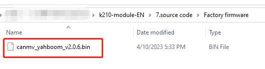The information in the source codeFolders found Factory firmwareName canmv_yahboom_vx. x. x. bin, where vx. x. x is the version number. Here to burn v2. 0. 6 version of the firmware, for example.