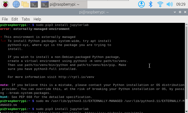 If you directly enter the command to install Jupyter Lab in the terminal, an "error: externally-managed-environment" error will appear. You can use the following command to solve it: The python version is modified according to the version of your own system. My current system version is 3.11.